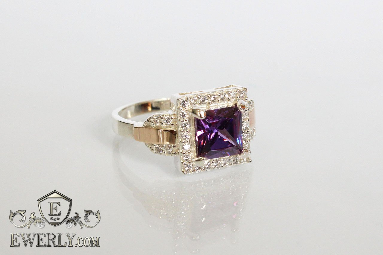 Эффектный квадратный фианит насыщенного аметистового (фиолетового) оттенка обрамлён сияющими белыми камнями меньшего размера. Основой служит натуральное серебро 925 пробы, дополненное изящной вставкой из золота 375 пробы.