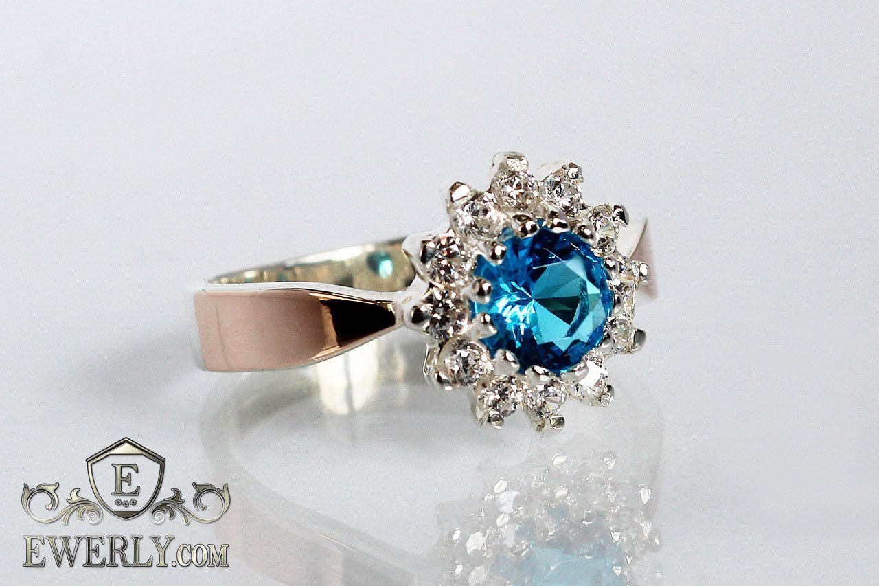 Женское серебряное кольцо (серебро 925 пробы) с золотом 375 пробы со светло-синим фианитом.